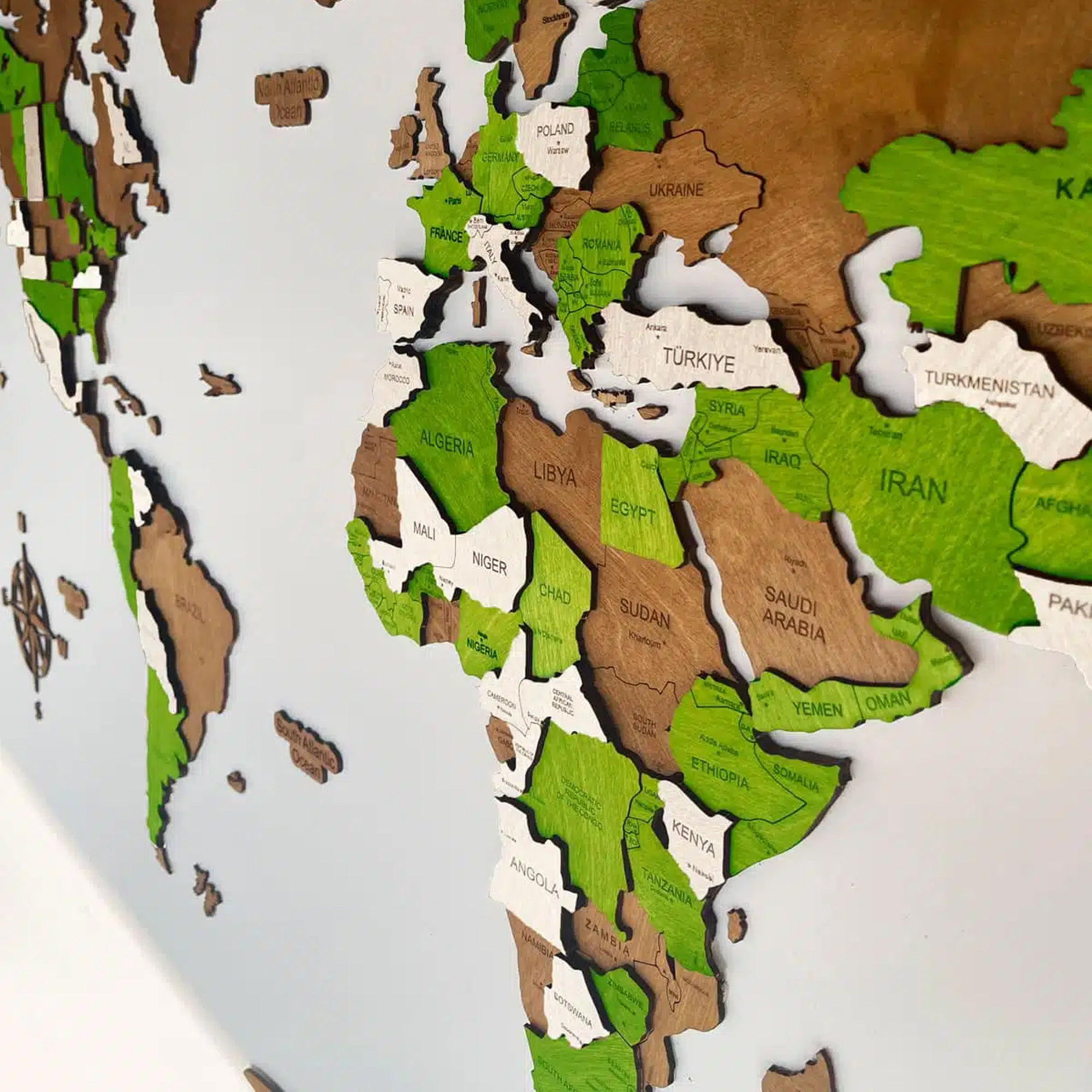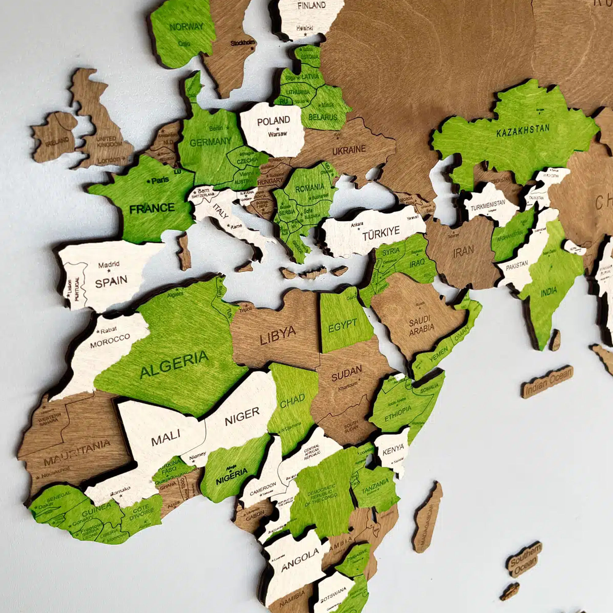 Each element is precisely cut to highlight the shapes of the continents and islands, while the layered construction gives the map a bold, sculptural presence on your wall. Despite its solid look, the installation is simple and intuitive.