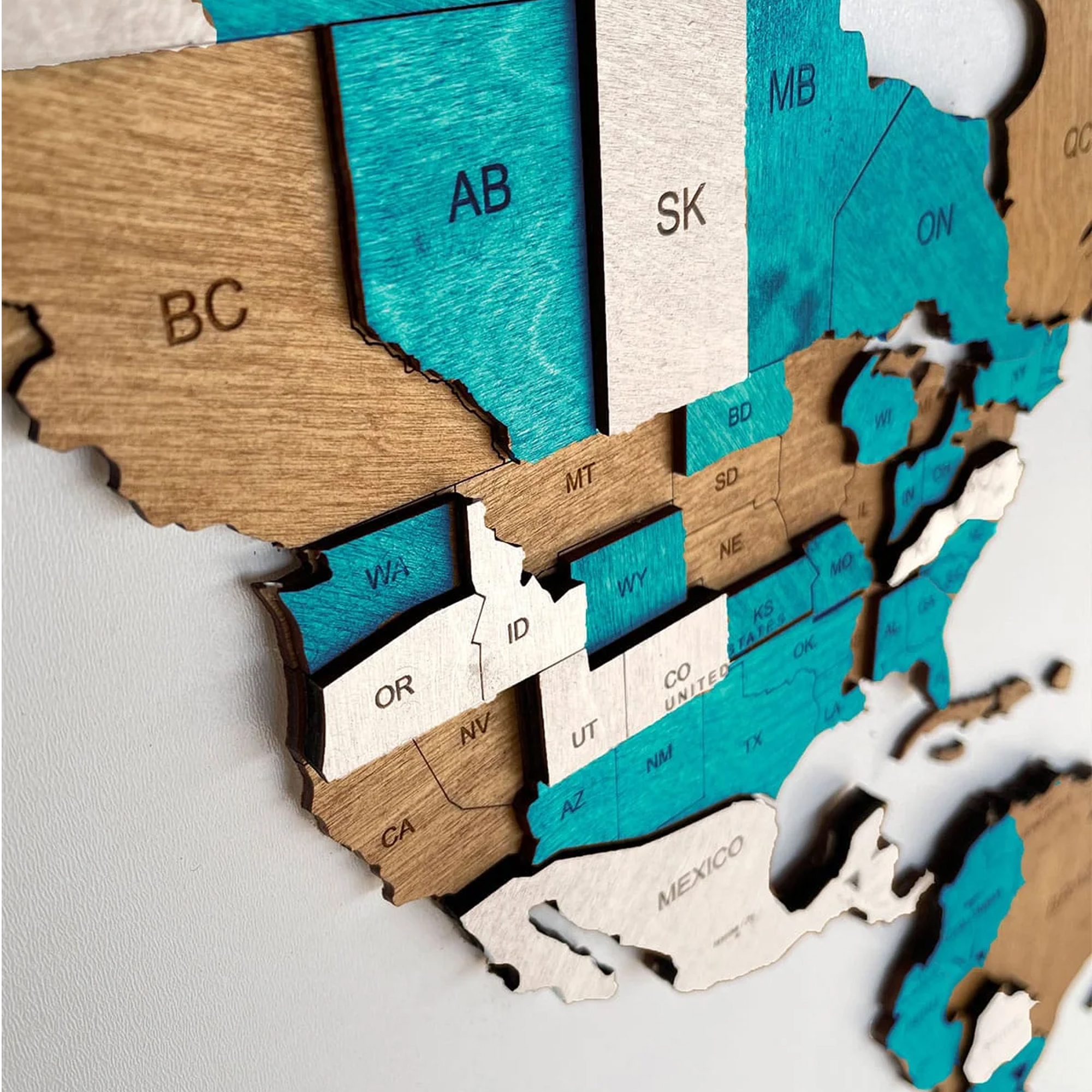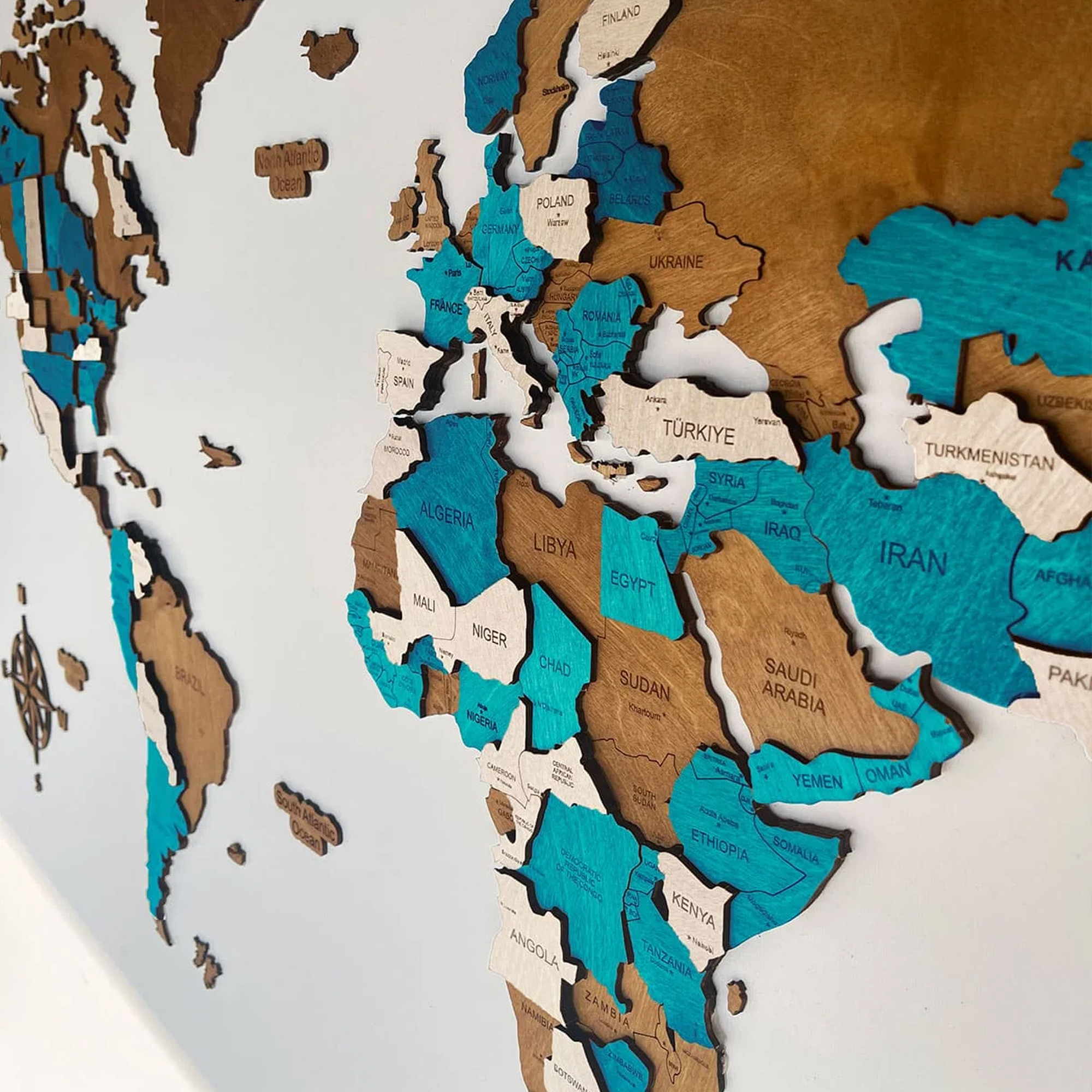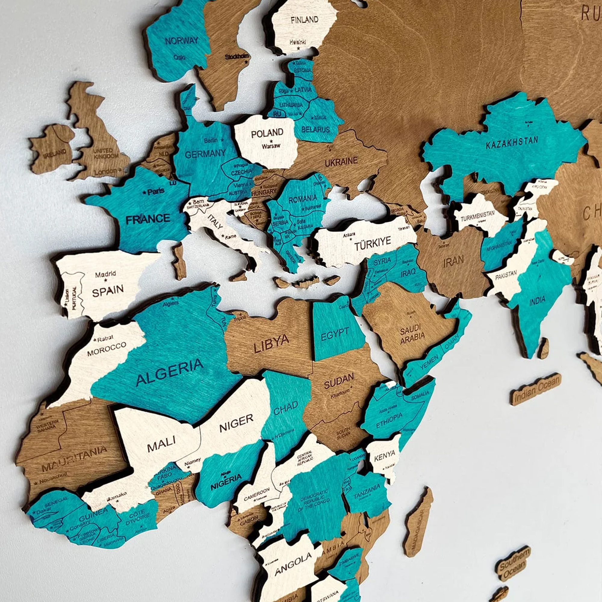 Each element is precisely cut to highlight the shapes of the continents and islands, while the layered construction gives the map a bold, sculptural presence on your wall. Despite its solid look, the installation is simple and intuitive.