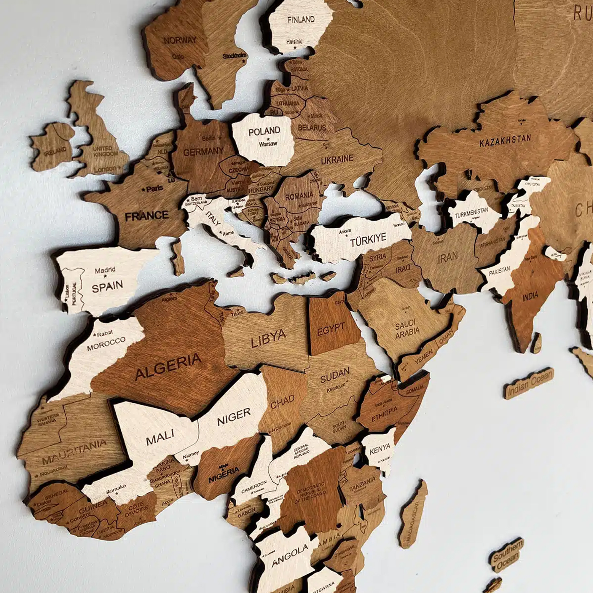 Each element is precisely cut to highlight the shapes of the continents and islands, while the layered construction gives the map a bold, sculptural presence on your wall. Despite its solid look, the installation is simple and intuitive.